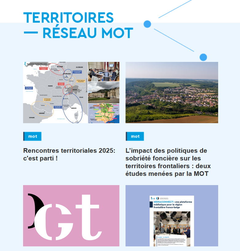 Chaque mois, la MOT publie une newsletter dédiée à la coopération transfrontalière : projets, initiatives locales, actualités nationales et européennes, revue de presse, agenda et publications.