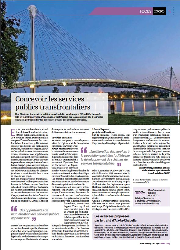 Article scientifique / Dictionnaire « Concevoir les services publics frontaliers » avril 2019 Article de Jean Peyrony. Publié dans la revue "Intercommunalités", Ed. ADCF, N°238, avril 2019, pp. 5.