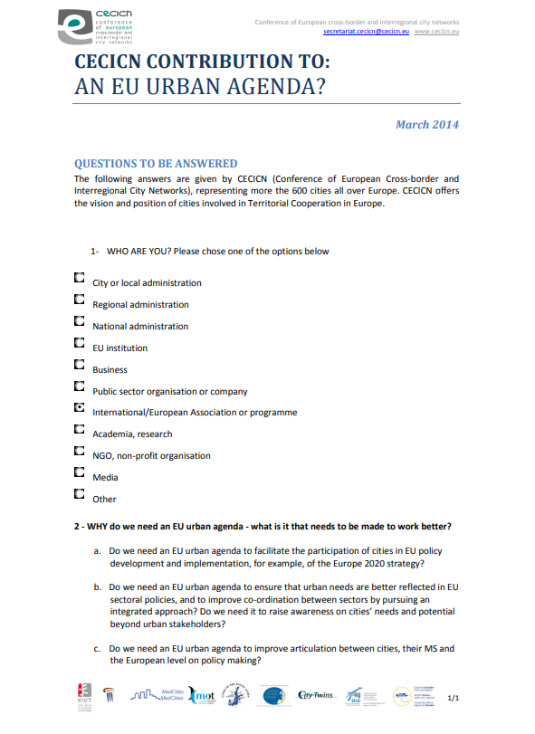 Prise de position / Manifeste Un agenda urbain de l’UE ? mars 2014 Contribution de la CECICN à la consultation sur "Un agenda urbain de l'UE ?" de la Commission européenne.