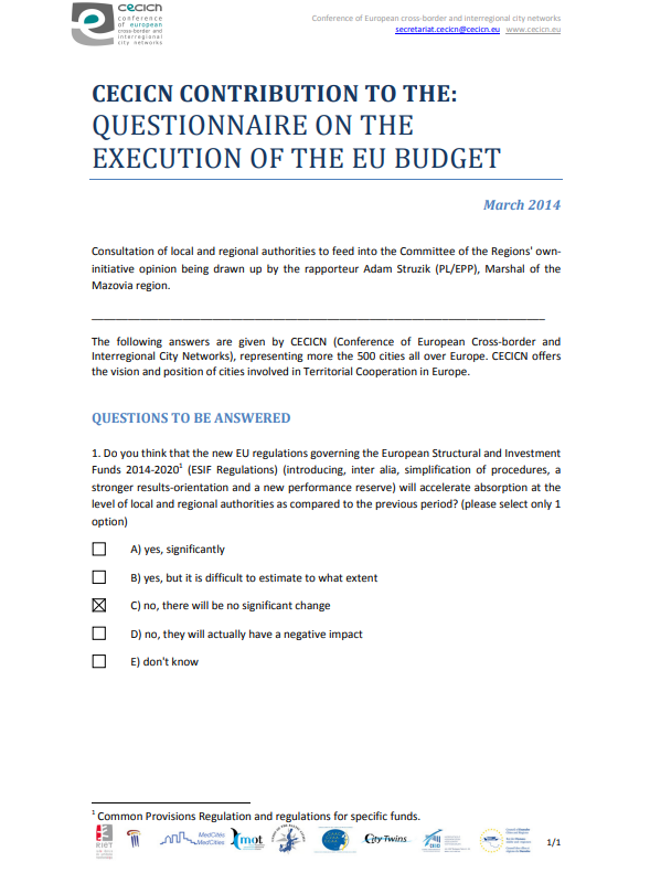 Prise de position / Manifeste Exécution du budget de l’UE mars 2014 Contribution de la CECICN au questionnaire sur l'exécution du budget de l'UE lancé par le Comité des Régions.