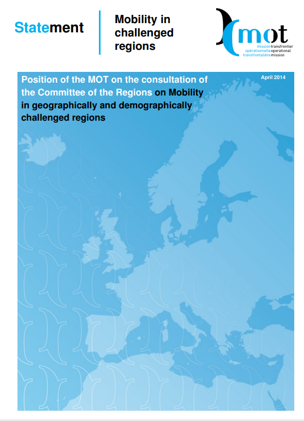 Prise de position / Manifeste Mobilité dans les régions qui souffrent de handicaps naturels ou démographiques avril 2014 Contribution de la MOT à la consultation du Comité des Régions sur la "Mobilité dans les régions qui souffrent de handicaps naturels ou démographiques" dont les régions frontalières.