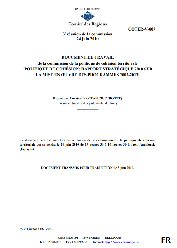Prise de position / Manifeste Politique de cohésion : rapport stratégique 2010 sur la mise en oeuvre des programmes 2007-2013 (CdR) juillet 2010 Contribution à la consultation du Comité des Régions sur le Document de travail de la Commission de la politique de cohésion territoriale : "Politique de cohésion : rapport stratégique 2010 sur la mise en oeuvre des programmes 2007-2013".