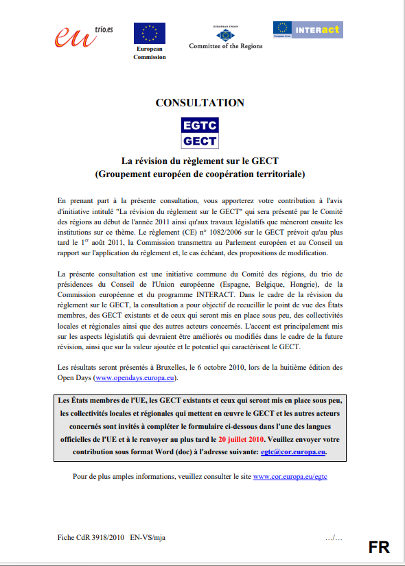 Prise de position / Manifeste Révision du règlement GECT (CE, CdR) juin 2010 Consultation commune de la Commission européenne et du Comité des Régions sur la révision du règlement sur le GECT. L'avis d'initiative élaboré par le Comité des Régions suite à cette consultation a permis de préparer les travaux des institutions communautaires en 2011 sur le réexamen du règlement sur le GECT.
