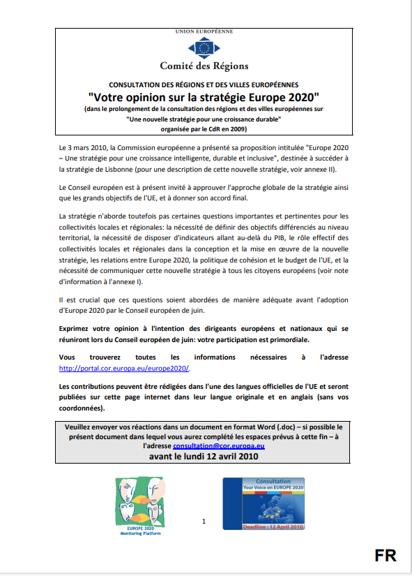 Prise de position / Manifeste « Votre opinion sur la stratégie Europe 2020 » (CdR) avril 2010 Contribution à la consultation du Comité des Régions : "Votre opinion sur la stratégie Europe 2020".