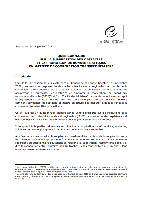 Prise de position / Manifeste Suppression des obstacles et promotion des bonnes pratiques en matière de coopération transfrontalière (Coe) janvier 2011 Réponse au questionnaire du Conseil de l'Europe sur la suppression des obstacles et la promotion de bonnes pratiques en matière de coopération transfrontalière.